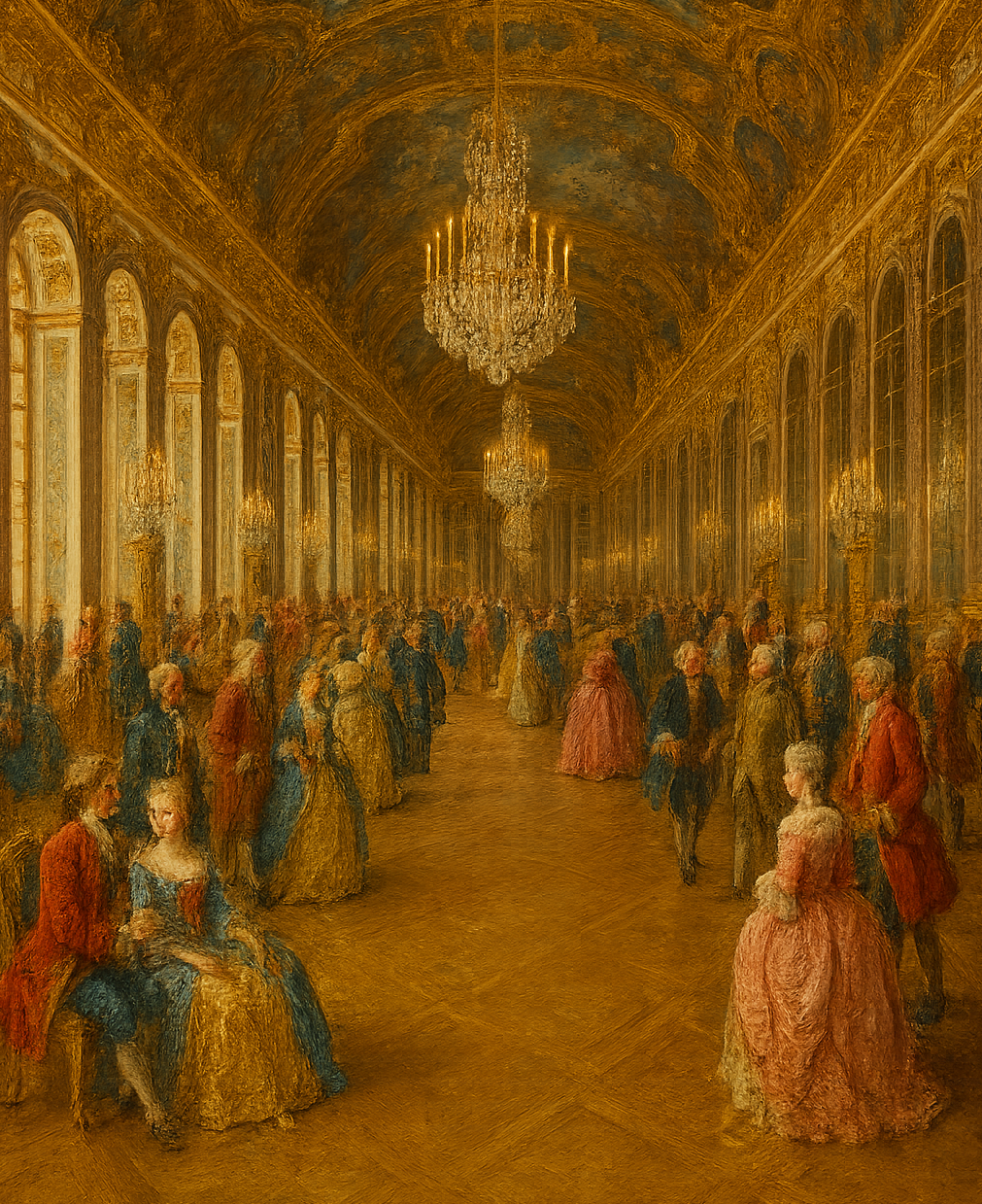 Versailles var en värld där allt glänste. Väggarna var täckta av speglar, takmålningar föreställde gudar och hjältar, och ljuset från tusentals stearinljus reflekterades i kristallkronor. Även de enklaste möblerna var konstverk – snidade, förgyllda och klädda i de dyraste tygerna från Lyon.