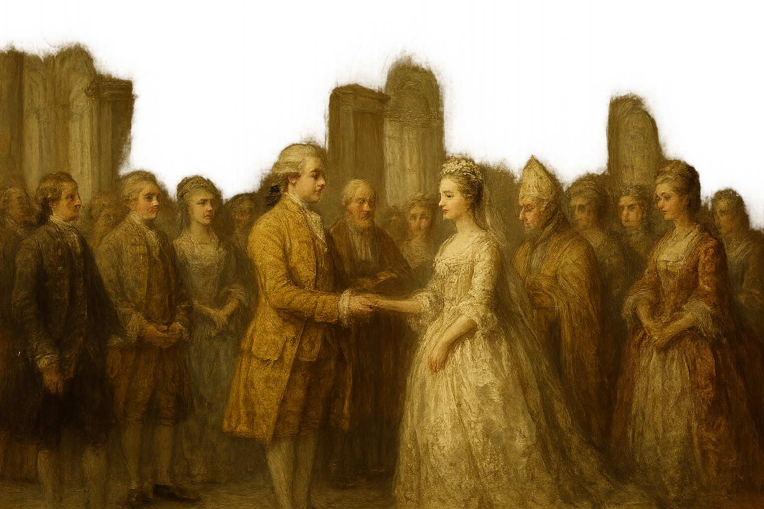 I maj 1770 möttes de två unga kungligheterna för första gången på slottet i Versailles, omgivet av hovfolk, präster och diplomater. Vigseln hölls i Versailles slottskapell, och festligheterna var storslagna: fyrverkerier, baler och banketter fyllde flera dagar. Paris glittrade, men i folkmassan fanns också oro – ett tecken på de spänningar som låg under ytan.