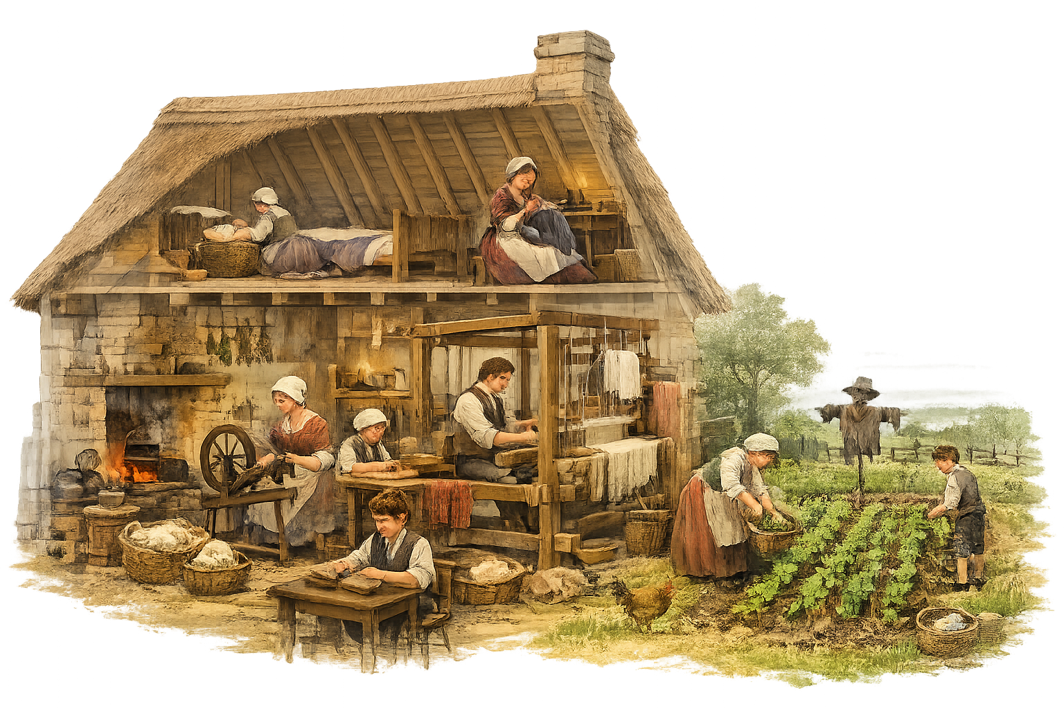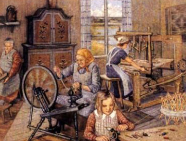 Under slutet av 1700-talet genomgick Storbritannien stora ekonomiska och sociala förändringar. Detta var en tid som brukar kopplas till början av den industriella omvandlingen av det brittiska samhället. Innan de stora fabrikerna slog igenom på allvar var dock produktionen ofta organiserad i en äldre form av tillverkning som kallas hemindustrin. I denna modell arbetade människor i sina egna hem istället för i stora fabriker. Råvaror lämnades ut av handelsmän och familjerna producerade varor som sedan samlades in och såldes vidare på marknader både i Storbritannien och i andra delar av världen. När jordbruket utvecklats mycket med nya metoder och grödor behövdes inte längre människorna arbeta på fälten hela tiden. Det fanns tid för att andra sysslor att sköta och skapa en extra inkomst vid sidan av jordbruket. Därför utvecklades hemindustrin ute på landsbygden i byarna.