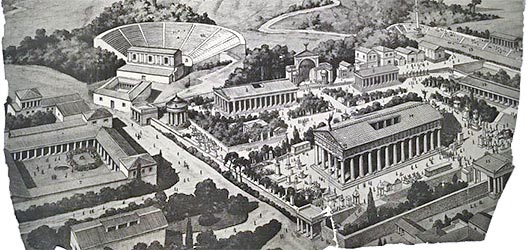 När de olympiska spelen öppnades, vilket skedde första fullmånen efter sommarsolståndet, förvandlades Olympia från en fridfull helig ort till en myllrande tältstad med tusentals besökare - som vår tids olympiabyar. Själva tävlingsområdet låg i Altis (som betyder lund) där det under århundradena växte fram enorma tempel- och idrottsanläggningar. Tävlingar som inte involverade hästar utfördes på stadion, medan kapplöpningar och kappkörningar ägde rum inne på hippodromen som var en oval anläggning anpassad för hästsporter.