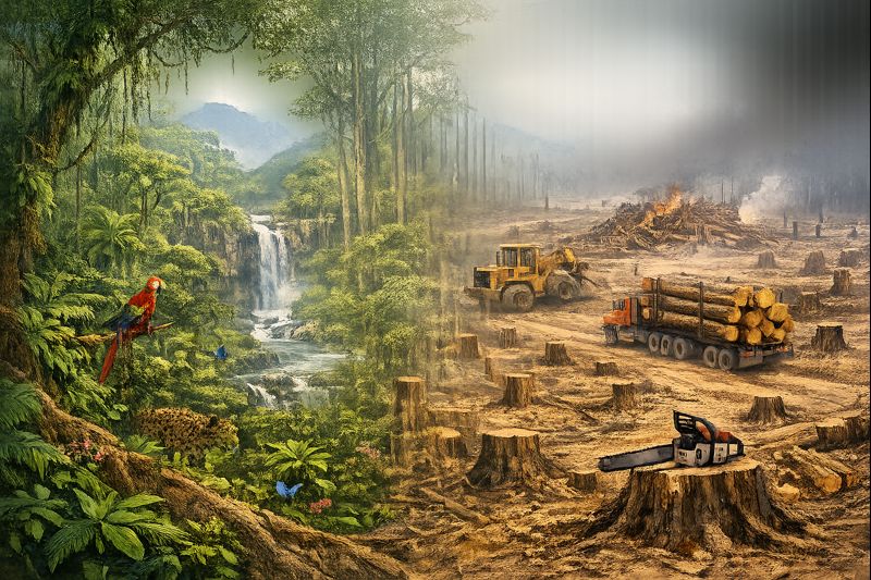 En annan viktig källa till utsläpp är skogsskövling. Skogar fungerar som planetens lungor: de tar upp koldioxid och släpper ut syre. När träd huggs ner försvinner inte bara deras förmåga att binda CO₂, utan den koldioxid som lagrats i träden frigörs dessutom. Detta förstärker uppvärmningen ytterligare. Särskilt oroande är avverkningen av tropiska regnskogar, som är några av världens viktigaste koldioxidsänkor. Den mest kända regnskogen är Amazonas i Brasilien.