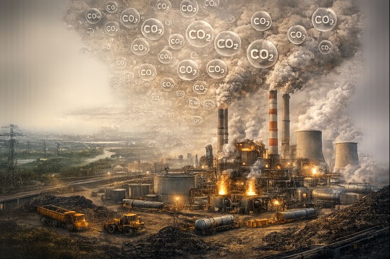 Industrin spelar också en stor roll. Många fabriker använder energi från fossila bränslen och släpper ut både koldioxid och andra kraftfulla växthusgaser. Tillverkningen av cement är ett exempel på en process som avger mycket CO₂, även om ingen förbränning är inblandad. Exempel på fossila bränslen är kol, olja och naturgas.
