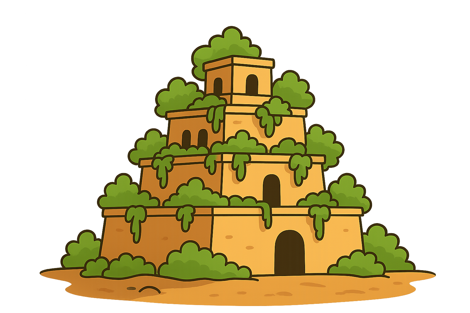 Enligt legenden byggdes dessa terrasserade trĂ€dgĂ„rdar av kung Nebukadnessar II för hans hustru Amytis, som lĂ€ngtade efter de gröna bergen i sitt hemland. TrĂ€dgĂ„rdarna ska ha varit fyllda med exotiska vĂ€xter, fontĂ€ner och skuggrika gĂ„ngar â en konstgjord oas i öknen. Deras exakta existens har dock aldrig bekrĂ€ftats arkeologiskt, vilket gör dem till ett av historiens mest mytomspunna underverk. Beskrivs som terrasser med trĂ€d, blommor och fontĂ€ner som steg uppĂ„t som en grön kulle. Det Ă€r oklart om de verkligen existerade, men de symboliserar mĂ€nniskans förmĂ„ga att skapa natur och skönhet pĂ„ konstgjord vĂ€g.