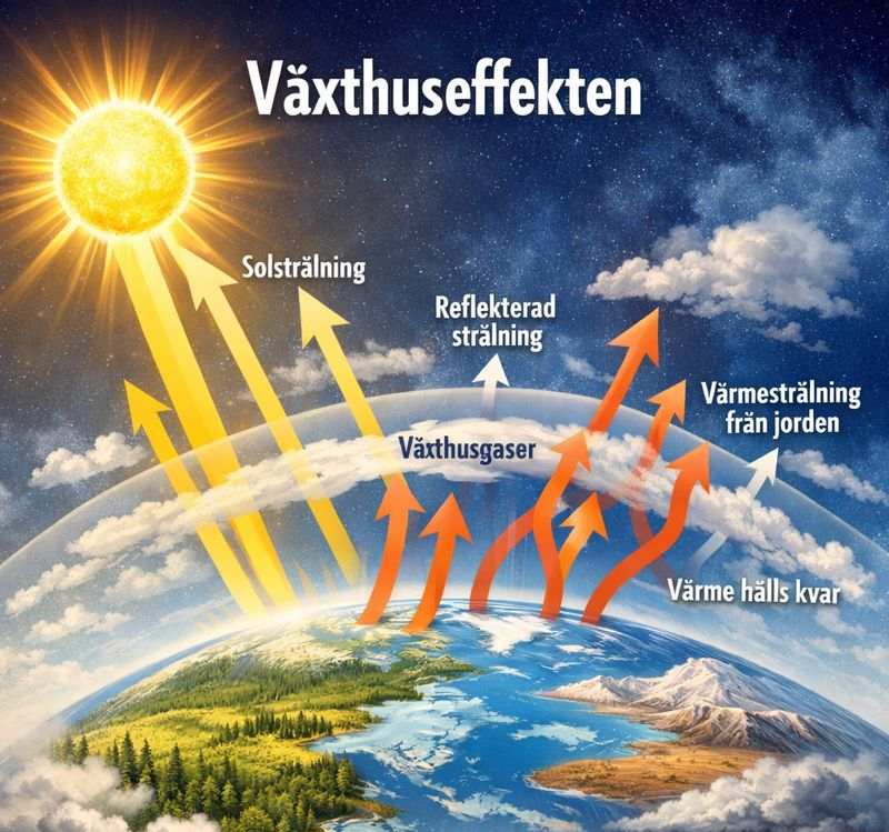 Växthuseffekten fungerar ungefär som glaset i ett växthus: den släpper in värme men hindrar en del av värmen från att försvinna ut igen. Det gör att det blir varmt i ett växthus på grund av solens värmeenergi som till stor del stannar kvar. All energi som driver växthuseffekten kommer från solen. När solens strålar når jordytan värms mark, vatten och växter upp. En del av solens strålning reflekteras direkt tillbaka ut i rymden, till exempel av moln, is och snö, men en stor del tas upp av jordytan.